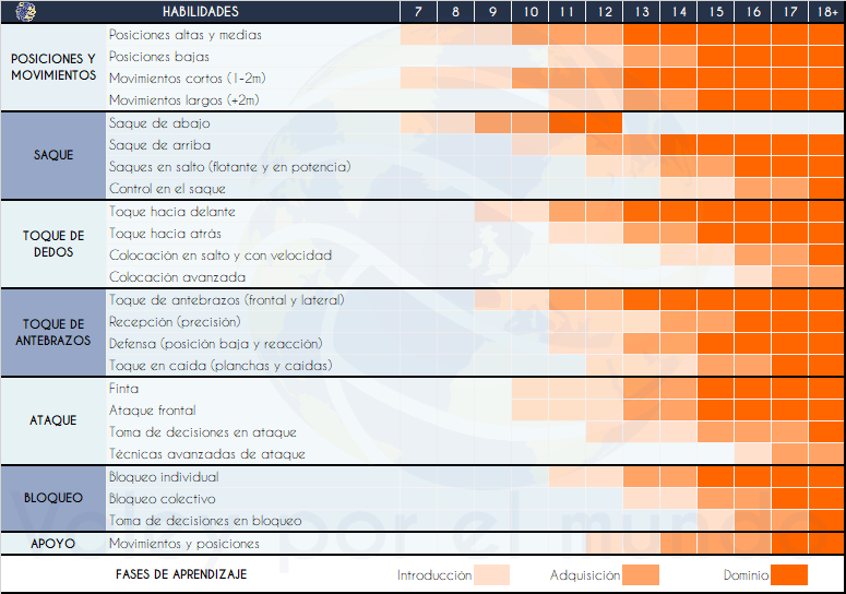Evidentemente hay que tener en cuenta que existen aspectos que pueden modificar las edades recomendadas para la introducción de cada habilidad o para adquirir suficiente dominio en la misma, como puede ser el desarrollo madurativo del deportista o la edad de iniciación en el voleibol. Por ello, recomendamos que los datos recogidos en este cuadro se utilicen sólo de manera orientativa, adaptándose siempre a las características de los jugadores.